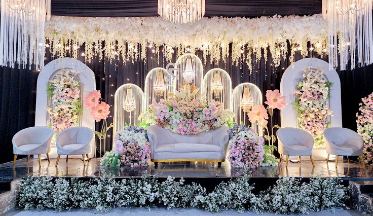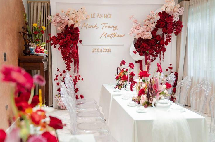 Thiết kế sân khấu kỷ niệm ngày cưới với backdrop hoa tươi, ánh sáng lung linh, giúp tôn vinh những khoảnh khắc đẹp và đáng nhớ của cặp đôi trong buổi lễ.