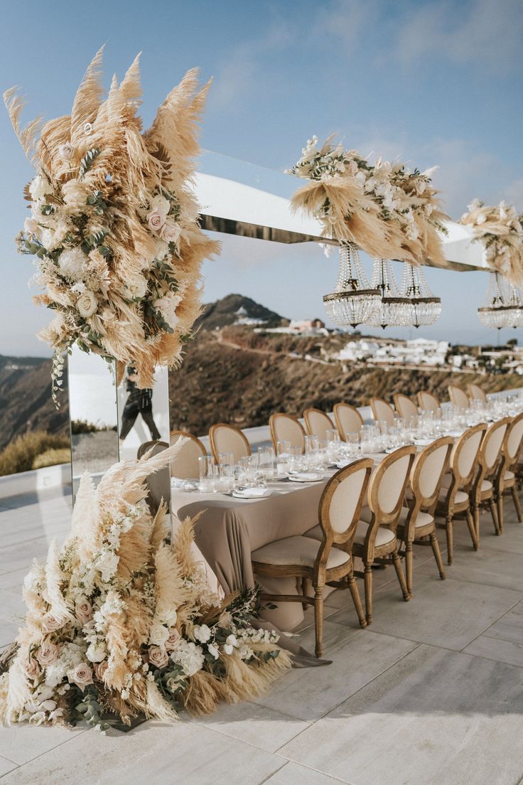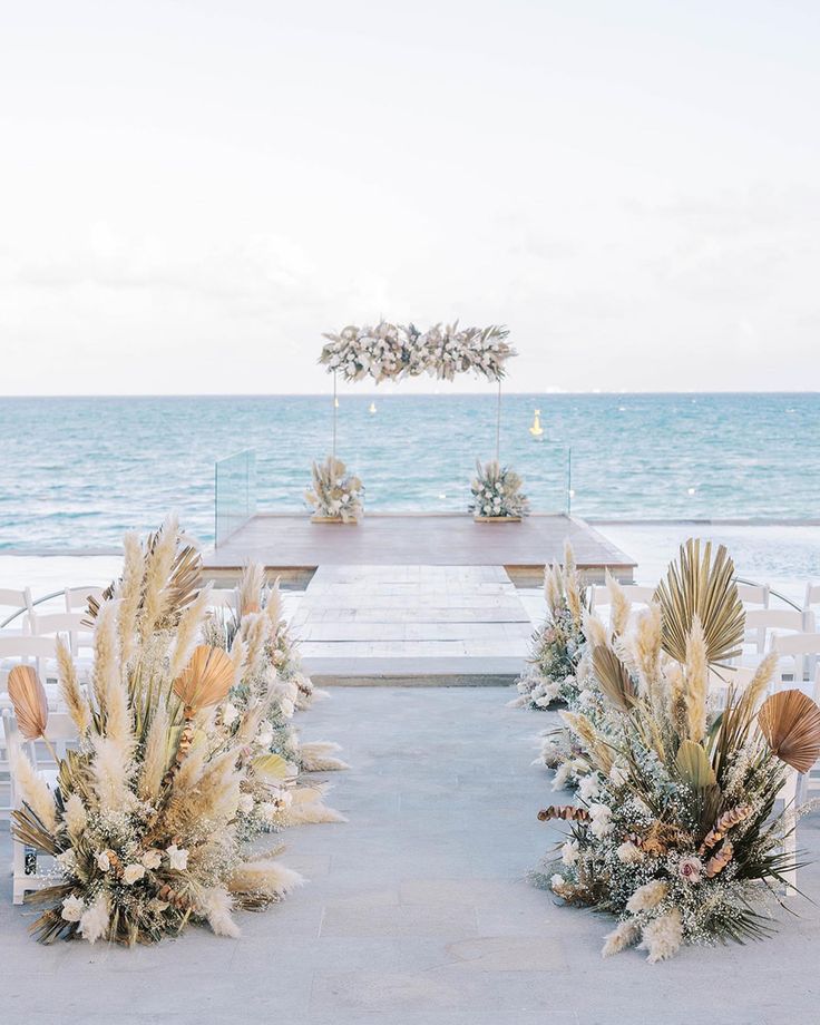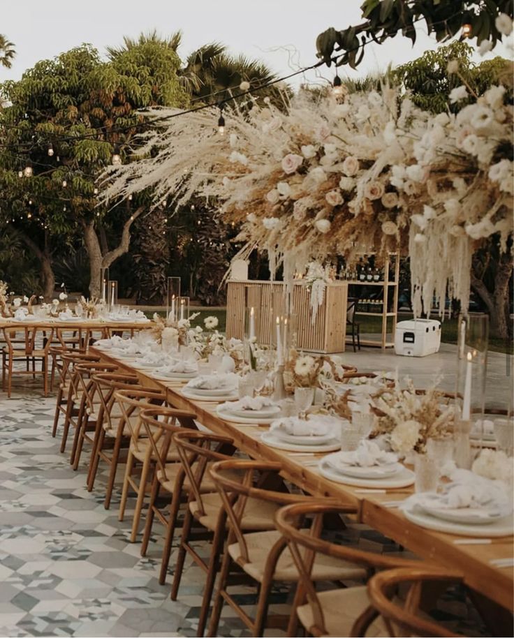 Phong cách Beachside Bliss phù hợp cho những đám cưới tổ chức bên bãi biển hoang sơ, nơi cát trắng, sóng biển rì rào và ánh nắng hoàng hôn cùng hòa quyện tạo nên một không gian lãng mạn. Trang trí tập trung vào các màu sắc tự nhiên như trắng, xanh biển, và xám cát, cùng các phụ kiện như vỏ sò, sao biển, và đèn lồng thắp nến.