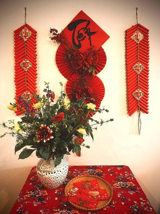 Decorating Tet with calligraphy paintings is very popular and carries the meaning of good luck with phrases like 'Happy New Year.' These paintings are often written on red paper, symbolizing happiness. In addition to calligraphy, you can use paintings of apricot blossoms, peach blossoms, or zodiac animals to make the space more vibrant.