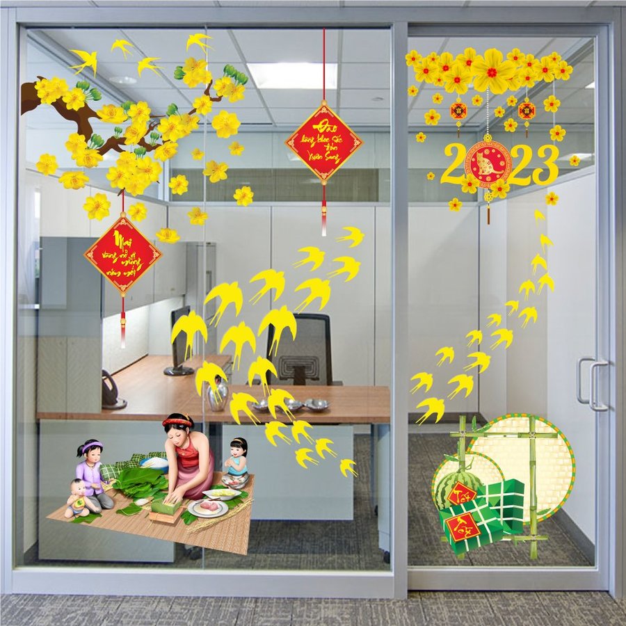 Decorating glass doors with decals is currently a popular choice due to its ease and high effectiveness. The decal images are diverse, often featuring a cheerful style rich in Tet culture, such as peach blossoms, apricot blossoms, fruit trays, the God of Wealth, Tet wish cards, calligraphers, lion dances, and dragon dances. In particular, the images of the twelve zodiac animals always serve as a distinctive highlight.
