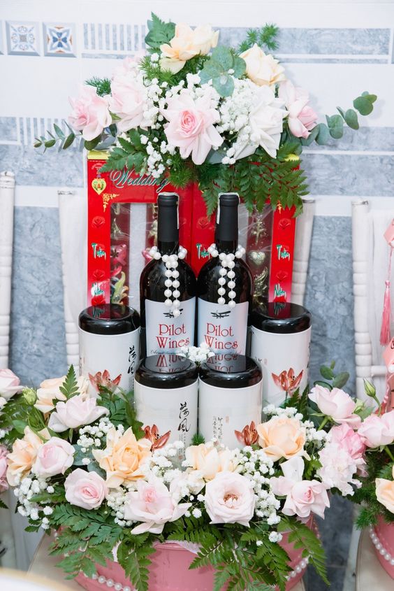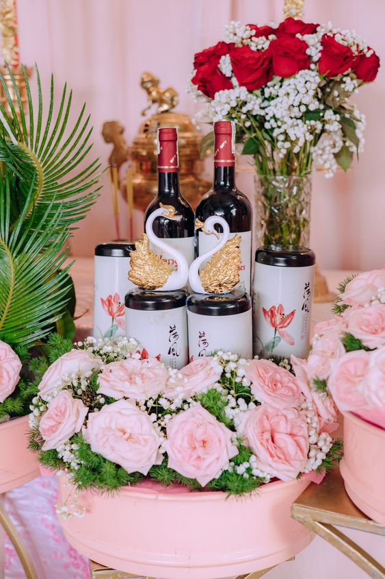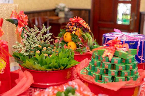 For people in the Central region, the wedding tray cannot lack betel and areca nuts, tea and wine, phu the cake and do hong candle. According to the concept of people in the Central region, betel and areca nuts symbolize a hundred years of happiness. So do hong symbolizes the happiness of a man and a woman being fulfilled. Phu the cake represents a warm and harmonious relationship between husband and wife. Tea and wine are to show respect and gratitude to ancestors.