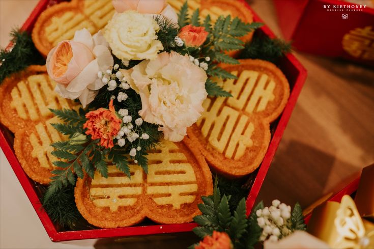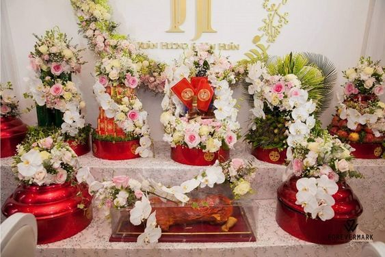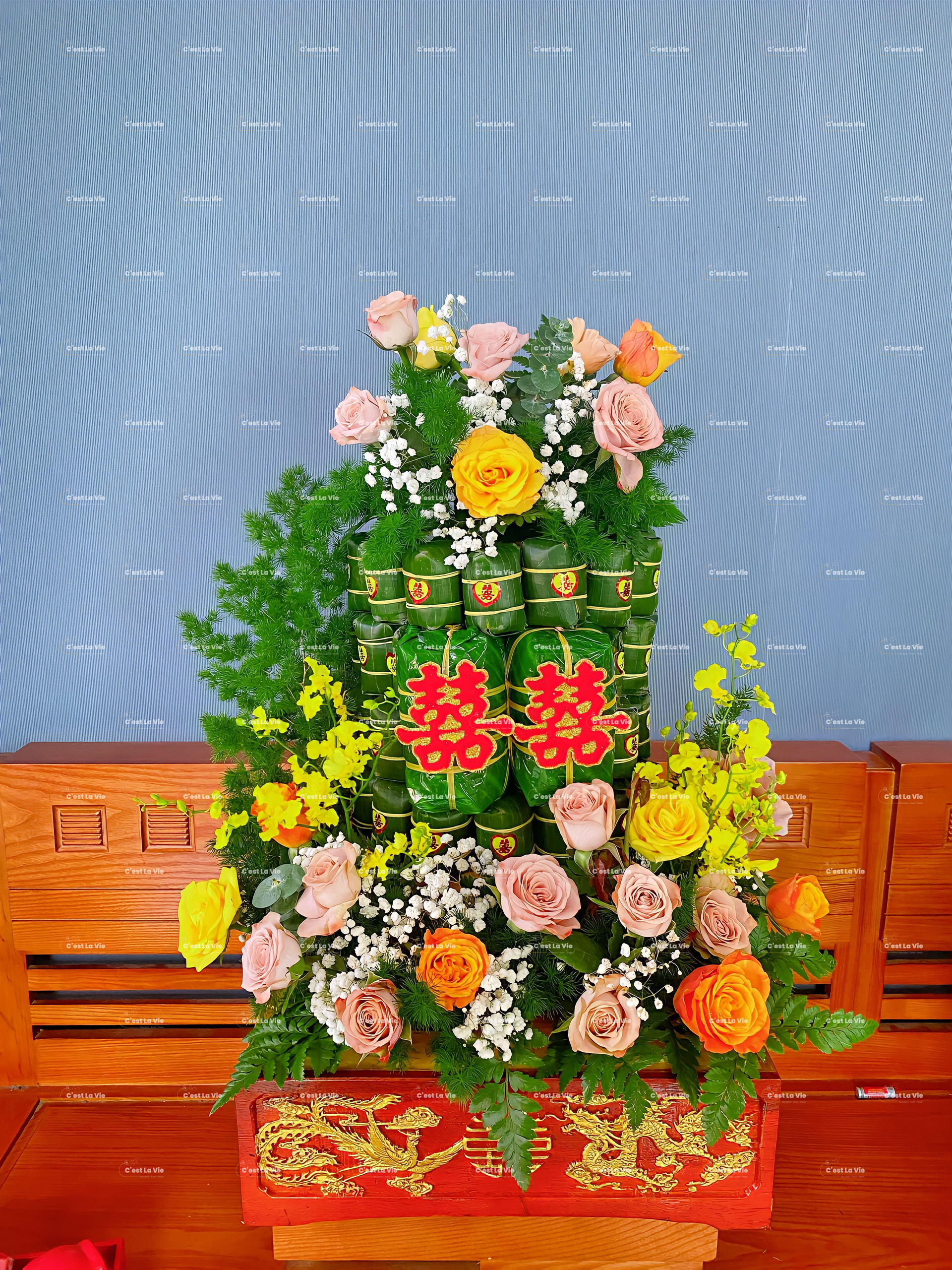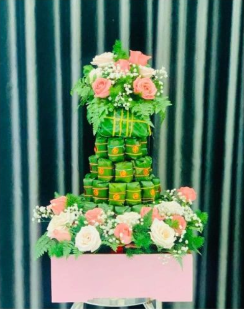To prepare the wedding tray at home, you need to buy items such as roast pig, cake, chicken sticky rice, and decorative items such as ribbons, fresh flowers, LED lights, and Hỷ paper.